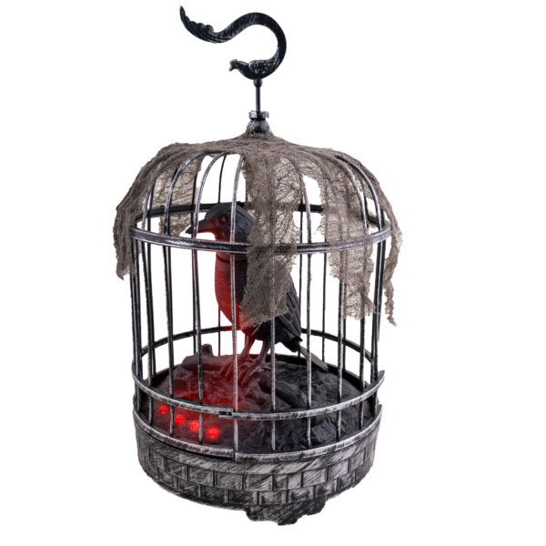 Deze Animatronic Crow in Cage lijkt rechtstreeks uit een nachtmerrie te komen. In zijn kooi beweegt de kraai levensecht terwijl zijn snavel meebeweegt. Hij maakt enge geluiden en praat. Zijn ogen en kooi lichten op, wat zorgt voor een extra spookachtig effect.