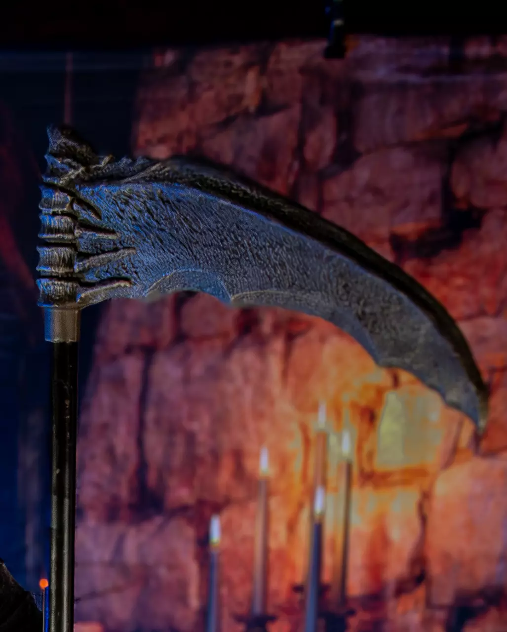 heeft een dodelijke zeis in zijn linkerhand en maakt intimiderende zinnen en geluiden